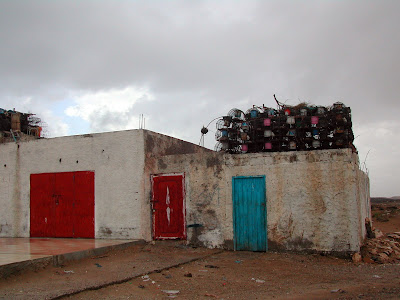 le vent, la pluie, les papiers, les poubelles, et au milieu de tout ça, ces jolies nasses toutes barriolées, ces portes bleues ou rouges sur fond blanc ... joli endroit. Je ne descends qu'un instant, emportée par le vent !