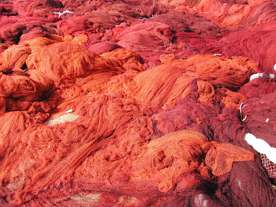 ... la vue d'un homme très âgé, penché sur ses filets, les couleurs tout autour, la sagesse qu'il dégage, le calme est son reflet, tirant sur le fil toujours avec la même régularité ... l'image est magnifique ... un échange, juste celui des yeux ... - "une photo, je peux ?" sans même me répondre, sans quitter son filet, juste un signe des yeux ... et son visage s'éclaire, il a dû baroudé celui-là tellement il est ridé ! ... mais son baroud à lui, c'était pas un 4*4, c'était pas une clio ! c'était certainement la barque du cousin, dans laquelle, chaque matin, il tirait ses filets pour nourrir ses enfants ... et justement au moment même où je regarde cet homme, où je le trouve beau ... un autre, son fils justement, sort du hangar et me demande "tu donnes de l'argent pour ta photo ?" - Non ! - "alors, tu la prends pas !" - y a pas de problème, mais c'est dommage parce qu'à ton père, je comptais lui donner de quoi se couvrir pour l'hiver .... et j'ai pas pris la photo ! son fils n'a pas voulu !