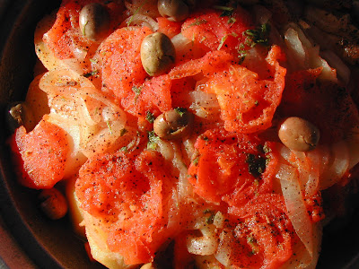 Pomme de terre, tomates ... c'est tout simple et rien à faire ... eh ben, là c'est un régal tellement il est saupoudré de coriandre, gingembre, cannelle, noix muscade semble-t-il, girofle peut-être, sel, poivre... olives et oignons translucides.