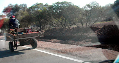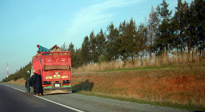 Christophe m'indique la direction de l'autoroute... Inutile de prendre une piste touristique à cette heure-ci ! Je vais mettre une heure pour sortir de la ville ! Non, non, j'ai bien le sens de l'orientation, même la nuit, même à Marakech ... C'est juste que la panique est telle dans cette ville que t'avance pas ! les rond-point : une vraie cata ! faut être sûre de pas te faire embarquer par le bus qui déboule puis qui stoppe net pour larguer 2 passagers, t'as les bagnoles, derrière qui klaxonnent, t'as les mobs qui te passent presque dessus ; les vélos, n'en parlons pas et je ne compte pas ceux qui t'insultent mais comme tu comprends pas, tu crois, pour de semblant, qu'ils te saluent ...