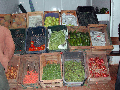 Pomme de terre, tomates ... c'est tout simple et rien à faire ... eh ben, là c'est un régal tellement il est saupoudré de coriandre, gingembre, cannelle, noix muscade semble-t-il, girofle peut-être, sel, poivre... olives et oignons translucides.