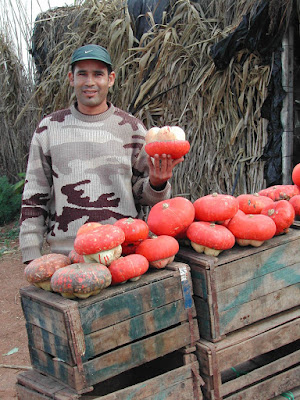 le temps ne s’est pas arrangé, bien au contraire. Et le contraste, entre le gris du ciel, la terre mouillée et les couleurs bariolées des cultures maraîchères et le vert de la nature, m’offre un spectacle absolument magique. Je m’arrête, évidemment ! Impossible de descendre, mais comme pour me faire plaisir, le soleil, un instant va pointer un rayon … c’est ce qui m’étonnait aussi. Il peut pleuvoir à torrents (la pluie est différente de chez nous) et tout à coup, une éclaircie…et c’est ainsi, sous un joli soleil, qu’au km 49, j’ai rencontré Hamid ! parce que la pluie s’est calmée, et que son étalage était particulièrement bien disposé et coloré, j’ai fait une halte ! j’ai acheté deux courges, puis nous avons parlé, j’ai pris quelques photos … il a voulu « poser », alors, comme un habitué des projos, il a rangé son étalage, a choisi les légumes et me les a montrés. Clic. Puis une idée m’est venue … il est sympa Hamid, c’est pas tous les jours qu’on le prend en photo et surtout, c’est pas tous les jours qu’on lui en offre une… Hamid, un stylo, s’il te plaît … tiens, pour une fois c’est moi qui réclame un stylo ! Et Hamid m’a donné son adresse au Km 49 … Il va les recevoir !