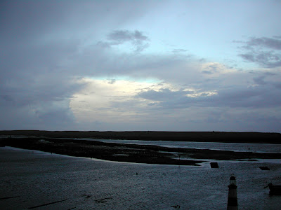 Au petit matin, une vue panoramique … un vrai bonheur … je me réveille très tôt … la marée est basse … et apparaissent les parcs à huîtres … enfin, je pense que c’est ça, ces trucs carrés qui émergent. J’attends un petit peu que le soleil se lève.